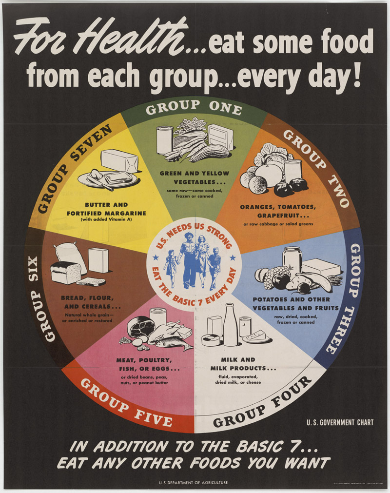 To combat this "hidden hunger," the Nutrition Division of the War Food Administration designed and deployed a new food guide to reflect the realities of wartime food shortages and rationing of meat, sugar, eggs, and butter. Previously in separate groups, meat and eggs were combined with beans and fish as alternative proteins.