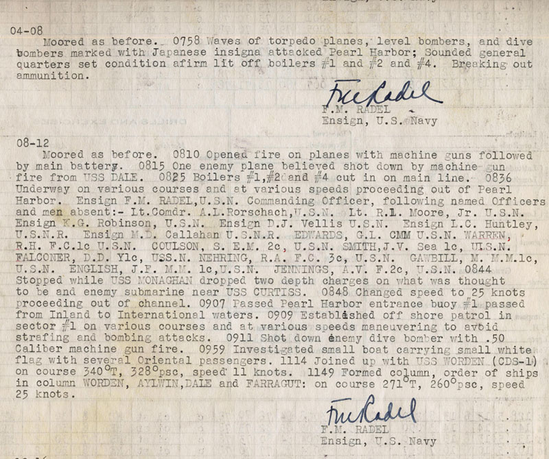 Moored as before. 0810 opened fire on planes with machine guns followed by main battery. 0815 One enemy plane believed shot down by machine gun fire from USS DALE. 0825 Boilers #1, #2, and #4 cut in on main line. 0836 Underway on various courses and at various speeds proceeding out of Pearl Harbor. Ensign F.M. Radel, U.S.N. Commanding Officer, following named officers and men absent:- Lt.Comdr. A.L. Rorschach, U.S.N. Lt. R.L. Moore, Jr., U.S.N. Ensign K.G. Robinson, U.S.N. Ensign D.J. Vellis U.S.N., Ensign L.C. Huntley, U.S.N.R. Ensign M.D. Callahan U.S.N.R. EDWARDS, G.L. CMM U.S.N. WARREN, R.H. F.C.lc U.S.N. COULSON, S.E.M. 2c, U.S.N. SMITH, J.V. Sea lc. U.S.N.FALCONER, D.D. Ylc., U.S.S.N. NEHRING, R.A. F.C. 3c, U.S.N. GAWBILL, M. M.M.lc, U.S.N. ENGLISH, J.F. M.M.lc, U.S.N. JENNINGS, A.V. F.2c, U.S.N. 0844 Stopped while USS MONAGHAN dropped two depth charges on what was thought to be an enemy submarine near USS CURTIS. 0848 Changed speed to 25 knots proceeding out of channel. 0907 Passed Pearl Harbor entrance buoy #1 passed from Inland to International waters. 0909Established off shore patrol in sector #1 on various courses and at various speeds maneuvering to avoid strafing and bombing attacks. 0911 Shot down enemy dive bomber with .50 Caliber machine gun fire. 0959 Investigated small boat carrying small white flag with several Oriental passengers. 1114 Joined up with USS WORDEN (CDS-1) on course 340°T, 328°psc, speed 11 knots. 1149 Formed column, order of ships in column WORDEN, ALWYN, DALE, AND FARRAGUT: on course 271°T, 260°psc, speed 25 knots.