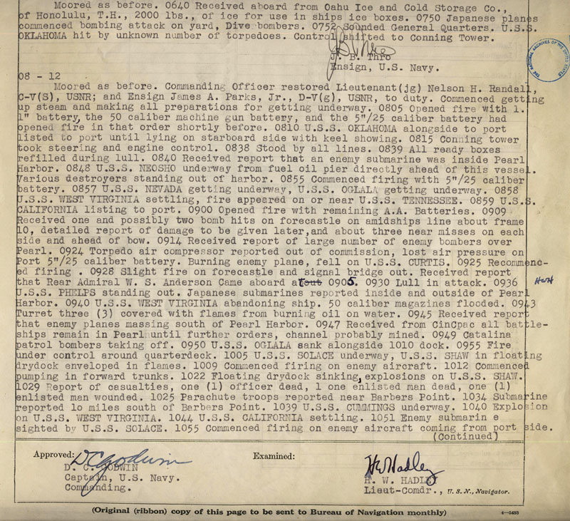 Moored as before. Commanding Officer restored Lieutenant (jg) Nelson H. Randall, C-V(S), USNR; and Ensign James A. Parks, Jr., D-V(g), USNR, to duty. Commenced getting up steam and making all preparations for getting underway. 0805 Opened fire with 1.1" battery, the 50 caliber machine gun battery, and the 5"/25 caliber battery had opened fire in that order shortly before. 0810 U.S.S. OKLAHOMA alongside to port listed to port until lying on starboard side with keel showing. 0815 Conning tower took steering and engine control. 0838 Stood by all lines. 0839 All ready boxes refilled during lull. 0840 Received report that an enemy submarine was inside Pearl Harbor. 0848 U.S.S. NEOSHO underway from fuel oil pier directly ahead of this vessel. Various destroyers standing out of harbor. 0855 Commenced firing with 5"/25 caliber battery. 0857 U.S.S. NEVADA getting underway, U.S.S. OGALA getting underway. 0858 U.S.S. WEST VIRGINIA settling, fire appeared on or near U.S.S. TENNESSEE. 0859 U.S.S. CALIFORNIA listing to port. 0900 Opened fire with remaining A.A. Batteries. 0909 Received one and possibly two bomb hits on forecastle on amidships line about frame 10, detailed report of damage to be given later, and about three near misses on each side and ahead of bow. 0914 Torpedo air compressor reported out of commission, lost air pressure on Port 5"/25 caliber battery. Burning enemy plane fell on U.S.S. CURTIS. 0925 Recommenced firing. 0928 Slight fire on forecastle and signal bridge out. Received report that Rear Admiral W. S. Anderson came aboard at 0905. 0930 Lull in attack. 0936 U.S.S. PHELPS standing out. Japanese submarines reported inside and outside of Pearl Harbor. 0940 U.S.S. WEST VIRGINIA abandoning ship. 50 caliber magazines flooded. 0943 Turret three (3) covered with flames from burning oil on water. 0945 Received report that enemy planes massing south of Pearl Harbor. 0947 Received from CincPac all battleships remain in Pearl until further orders, channel probably mined. 0949 Catalina patrol bombers taking off. 0950 U.S.S. OGALA sank alongside 1010 dock. 0955 Fire under control around quarterdeck. 1005 U.S.S. SOLACE underway, U.S.S. SHAW in floating drydock enveloped in flames. 1009 Commenced firing on enemy aircraft. 1012 Commenced pumping in forward trunks. 1022 Floating drydock sinking, explosions on U.S.S. SHAW. 1029 Report of casualties, one (1) officer dead, 1 one enlisted man dead, one (1) enlisted man wounded. 1025 Parachute troops reported near Barbers Point. 1034 Submarine reported 10 miles south of Barbers Point. 1039 U.S.S. CUMMINGS underway. 1040 Explosion on U.S.S. WEST VIRGINIA. 1044 U.S.S. CALIFORNIA settling. 1051 Enemy submarine sighted by U.S.S. SOLACE. 1055 Commenced firing on enemy aircraft coming from port side. 1100 Enemy reported approaching towards Pearl from South. 1150 Commenced firing. 1104 U.S.S. PHOENIX standing out. 1105 Cruiser and Destroyer standing out. 1106 450 rounds of 5"/25 caliber expended up to this time. 1107 Commenced firing on enemy planes on starboard beam. 1112 Enemy tanker reported to southward. 1114 Commenced firing on enemy planes. 1119 oil fire on water around U.S.S. WEST VIRGINIA getting worse, approaching stern of this vessel. 1124 Opened fire on plane on port quarter. 1127 Eight enemy ships reported at Latitude 21° 10' N, Longitude 160° 16' west. 1127 Commenced firing at enemy planes, expended 15 rounds 5"/25 caliber. 1137 Parachute troops reported landing on North Shore. 1143 Report received enemy troops wearing blue coveralls with red emblems. 1145 Called away fire and rescue party to assist in rescue of U.S.S. OKLAHOMA personnel.