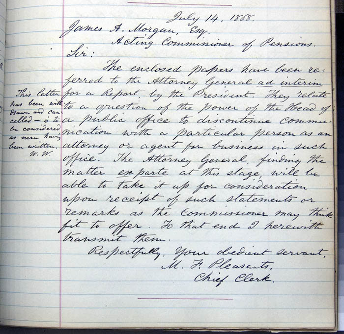 With regard to any one particular document we can only speculate about how Whitman might have served as author or copyist or both. Regarding the overall working of the office, we do have Whitman's description given in conversation with Horace Traubel: Whitman said he had been "put in charge of the Attorney General's letters." In this instance, Whitman did not specify which one he meant of the several attorneys general he served, perhaps implying that it was a common practice for them all.
