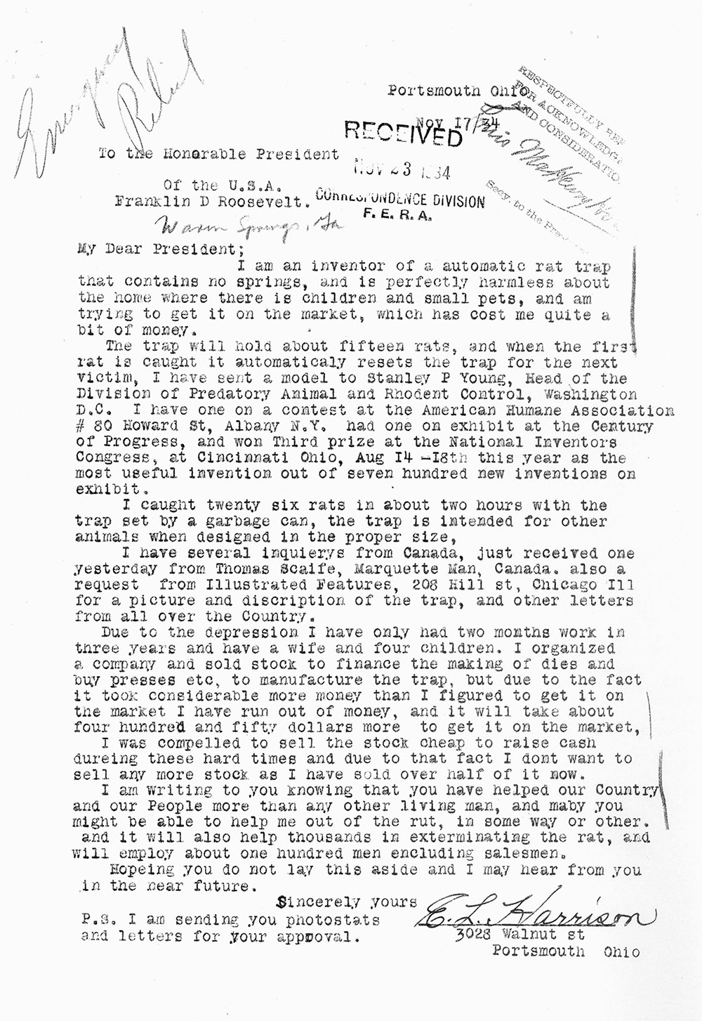 Other artisans and entrepreneurs hoped FERA would finance their ideas and inventions. E. L. Harrison of Portsmouth, Ohio, pitched his plan for "an automatic rat trap" directly to Roosevelt in the belief the President "helped our Country and our Oeople more than any other living man, and mayb [sic] you might be able to help me out of the rut, in some way or other."11
