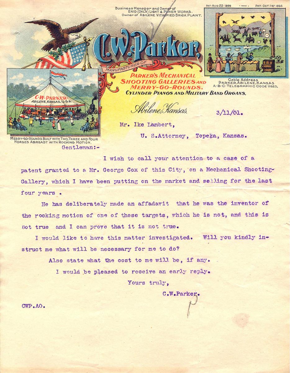 C. W. Parker’s correspondence about patents is in Letters Received by the U.S. Attorney, Office of the District of Kansas, Records of the Office of the U.S. Attorney, RG 118. Advertisements, equipment inventory lists, and contracts relating to one of Charles W. Parker’s carnival shows are in Parker v. The Independent Order of Owls, Equity Case File 278, Records of the U.S. District Court for Southern District of Iowa (Keokuk), Records of District Courts of the United States, RG 21.