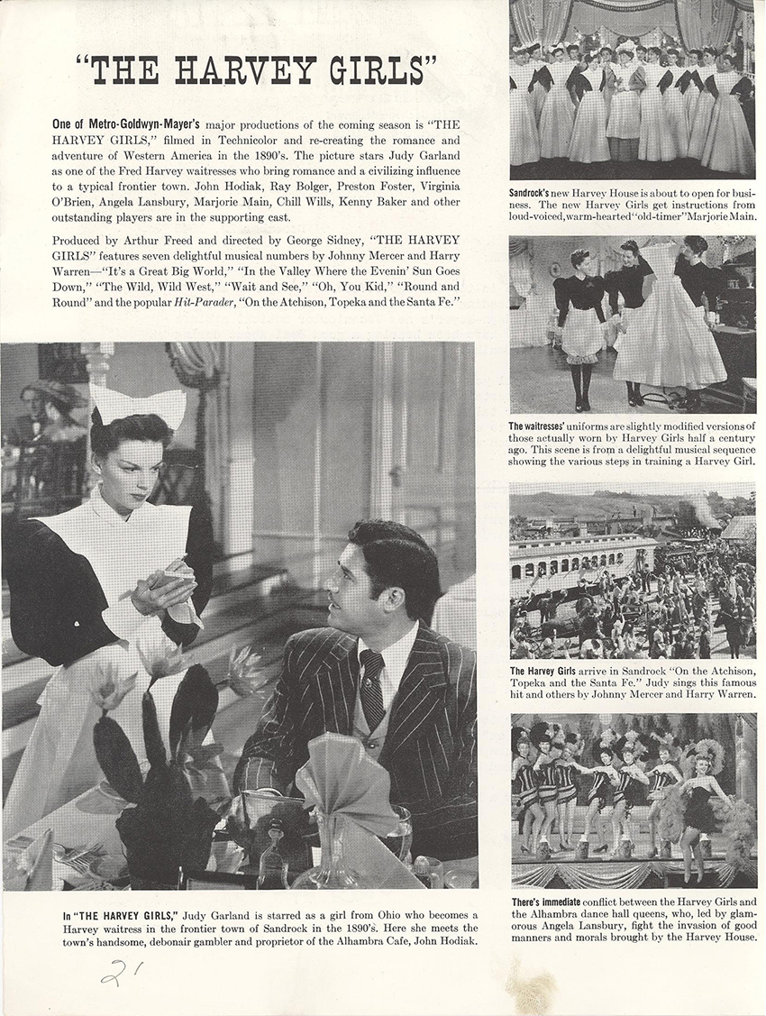 An advertisement for the film The Harvey Girls as well as three screenplays, photographs, articles, and hundreds of pages of depositions by Fred Harvey Company executives and key staff from Metro-Goldwyn-Mayer Pictures are in a copyright infringement case file, Civil Case 5713, Records of the U.S. District Court for the Western District of Missouri (Kansas City), Records of District Courts of the United States, RG 21.