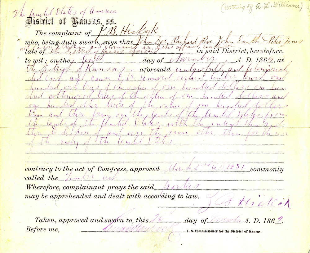 Court records relating to James Butler (“Wild Bill”) Hickok are in Records of the U.S. District Court for the First (Topeka) Division of the District of Kansas Criminal Case Files and in U.S. v. Jack McCall, Criminal Case 16, Criminal Cases October Term, 1876, U.S. District Court for the Dakota Territory, Records of District Courts of the United States, RG 21.