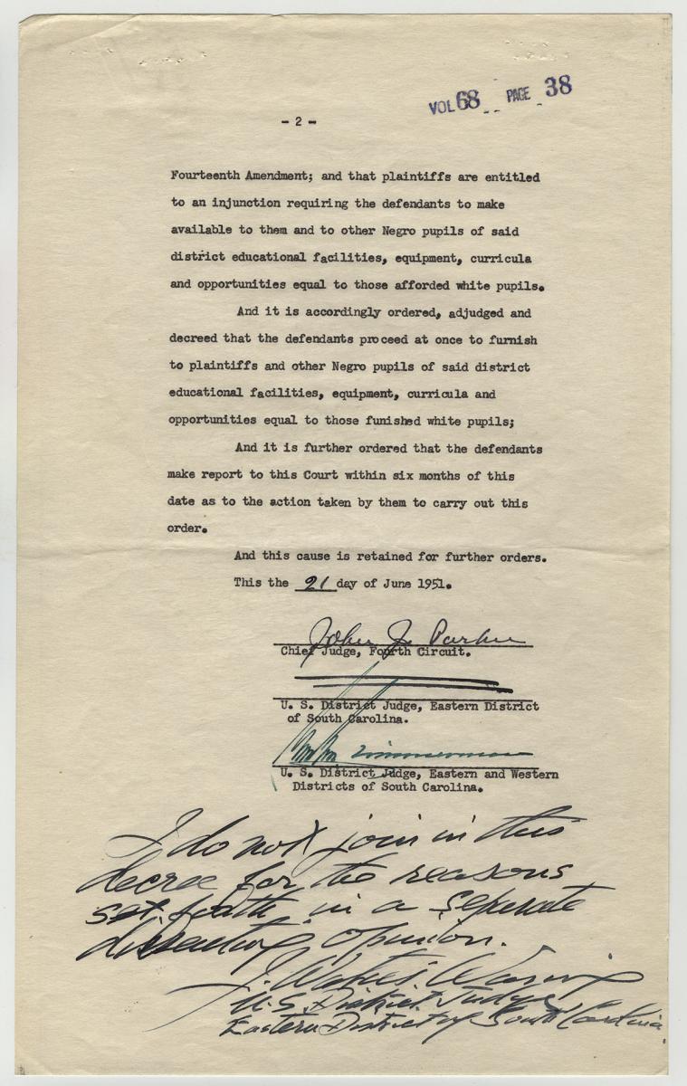 That petition led to a major civil rights court case, Briggs v. Eliott (1951), heard in the U.S. District Court for the Eastern District of South Carolina. Two of the three judges assigned to the case ruled in favor of the school board, holding that separate-but-equal school facilities were constitutional. The third judge, J. Waties Waring, wrote a dissenting opinion, noting that “segregation is per se inequality.”