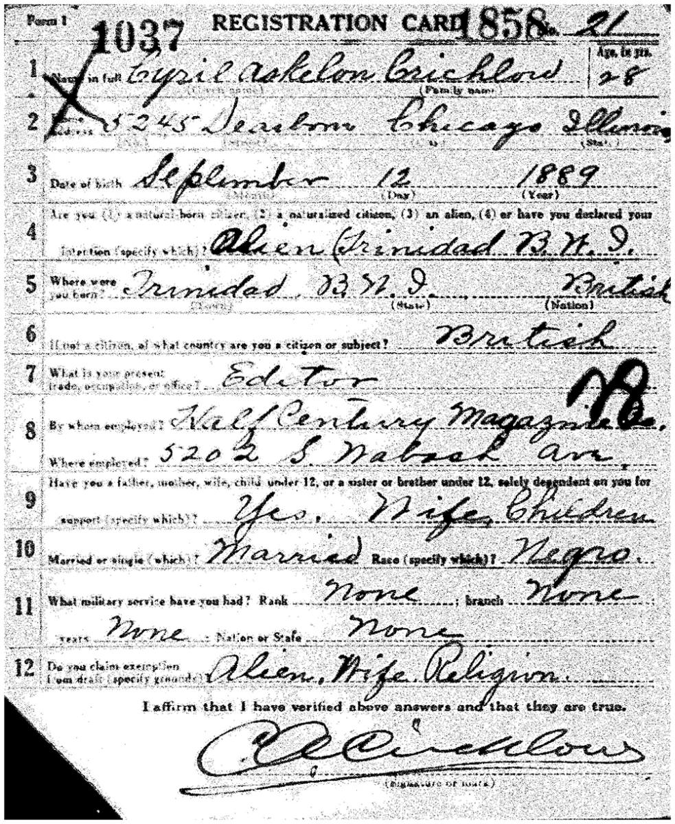 The card listed him as a resident alien and citizen of Trinidad, B.W.I. [British West Indies], residing at 5245 Dearborn in Chicago, Illinois. He was employed as an “Editor” at Half Century Magazine on Wabash Avenue; he had a wife and children as dependents; and he claimed exemption from the draft on the grounds that he was an alien and because of his religion.