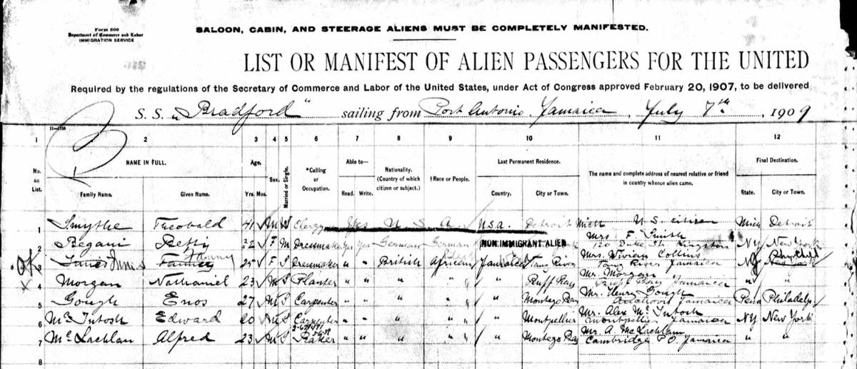 Enos Gough’s story is documented only in immigration, citizenship, and census records. A passenger manifest records his arrival in the Port of New York on July 7, 1909, from Port Antonio, Jamaica.