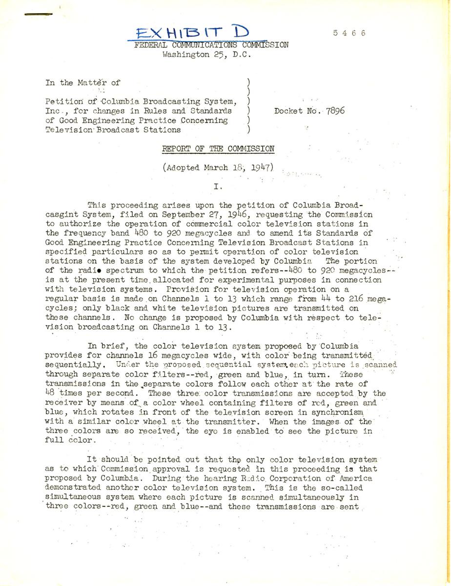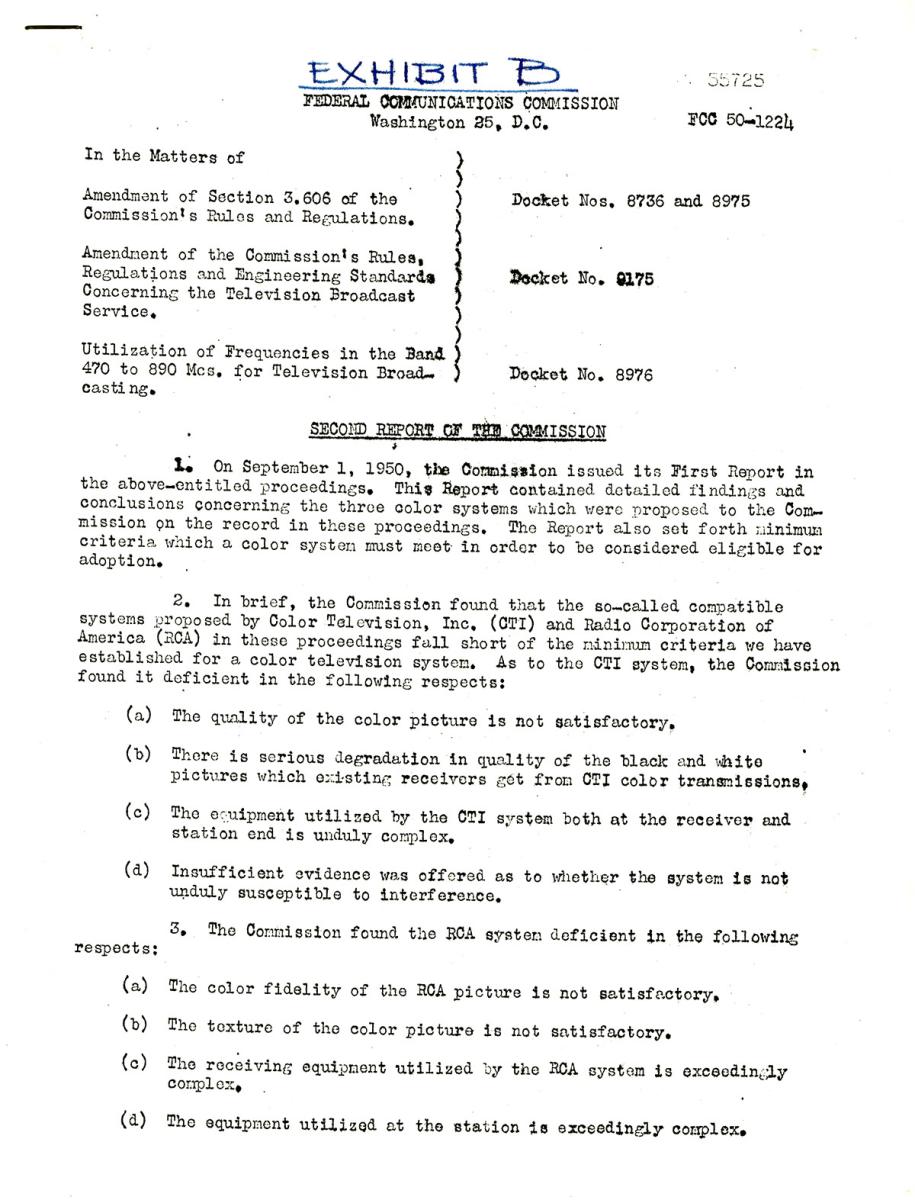 The commission’s second report, issued just a month later, included revised criteria, primarily that any system be able to operate in “six-megacycle channel (the frequency space allotted to black and white television broadcasting stations)” and that “the pictures be received on existing television receivers ‘simply by making relatively minor modifications in such existing receivers.’”