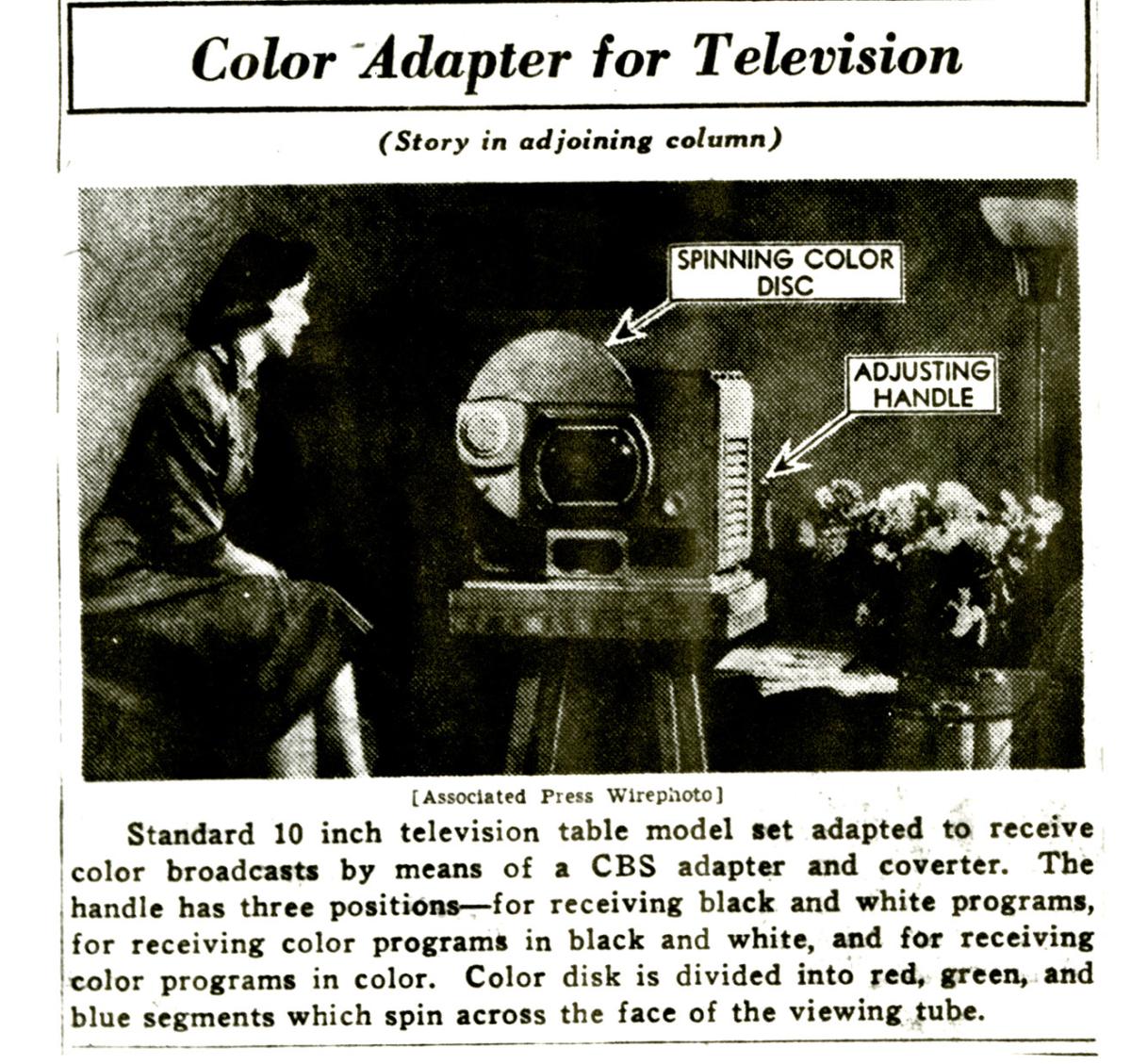 CBS had created a “sequential system,” which proposed the addition of a mechanical color rotating disc and an adapter consisting of tubes, condensers, and resistors to attach to the receiver. The red, blue, and green colors in the optical device were supposed to spin around quickly enough in front of the viewing tube to appear as a full color picture.