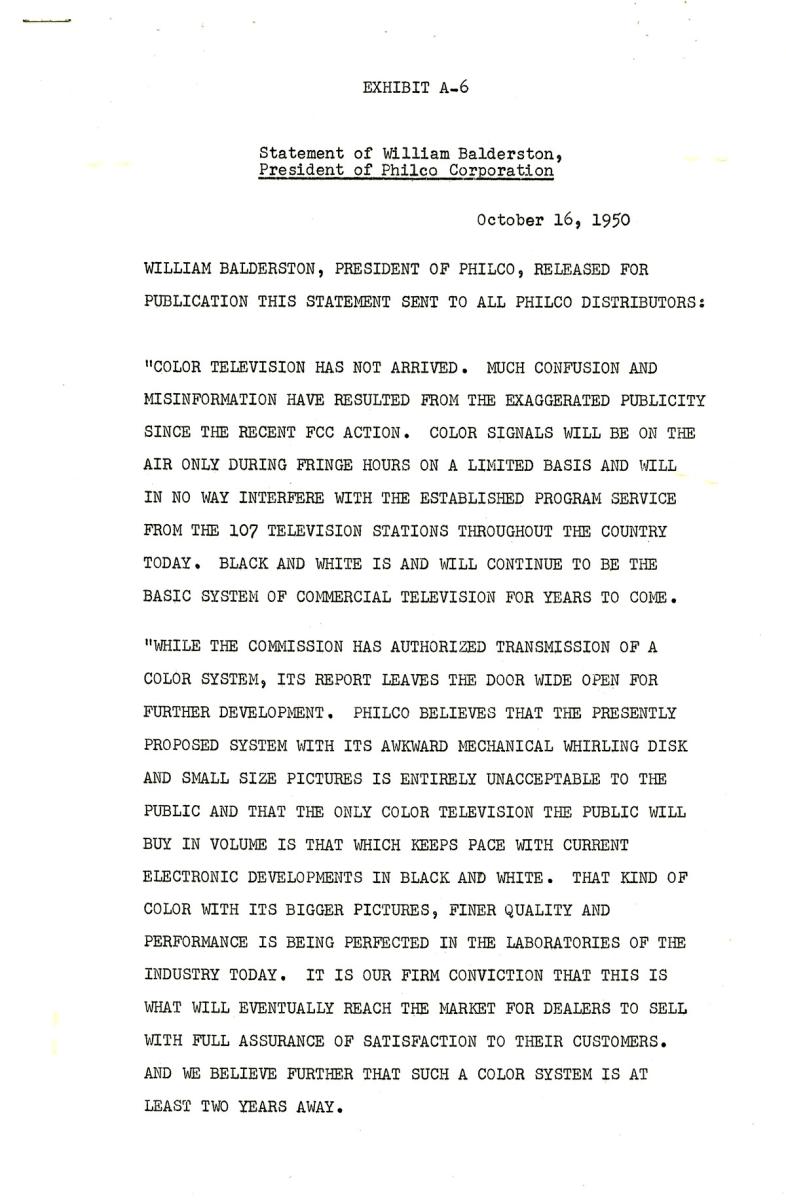 Frank Stanton, the president of CBS, was one of many who filed affidavits in the case. Stanton dismissed the plaintiffs’ objections, saying they would not suffer “irreparable injury caused by . . . the FCC’s order adopting standards for the color system developed by CBS.” He contended that the only injury the plaintiffs would suffer would be to “their pride and publicity” but that the public would be hurt should the order be suspended.