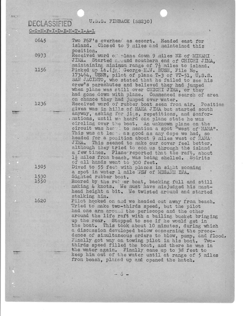 To stay out of the range of Japanese shore batteries the Finback maintained a distance of seven and a half miles away from shore. It took slightly more than two hours to get to the site where a crew member had bailed out. The crew of the Finback managed to fish out the pilot, Lt. (jg) George Herbert Walker Bush of Torpedo Squadron 51 from the USS San Jacinto. Bush told his rescuers he had not seen the parachutes of his crew and thought that they either jumped while the plane was over Chichi Jima or went down with the plane.