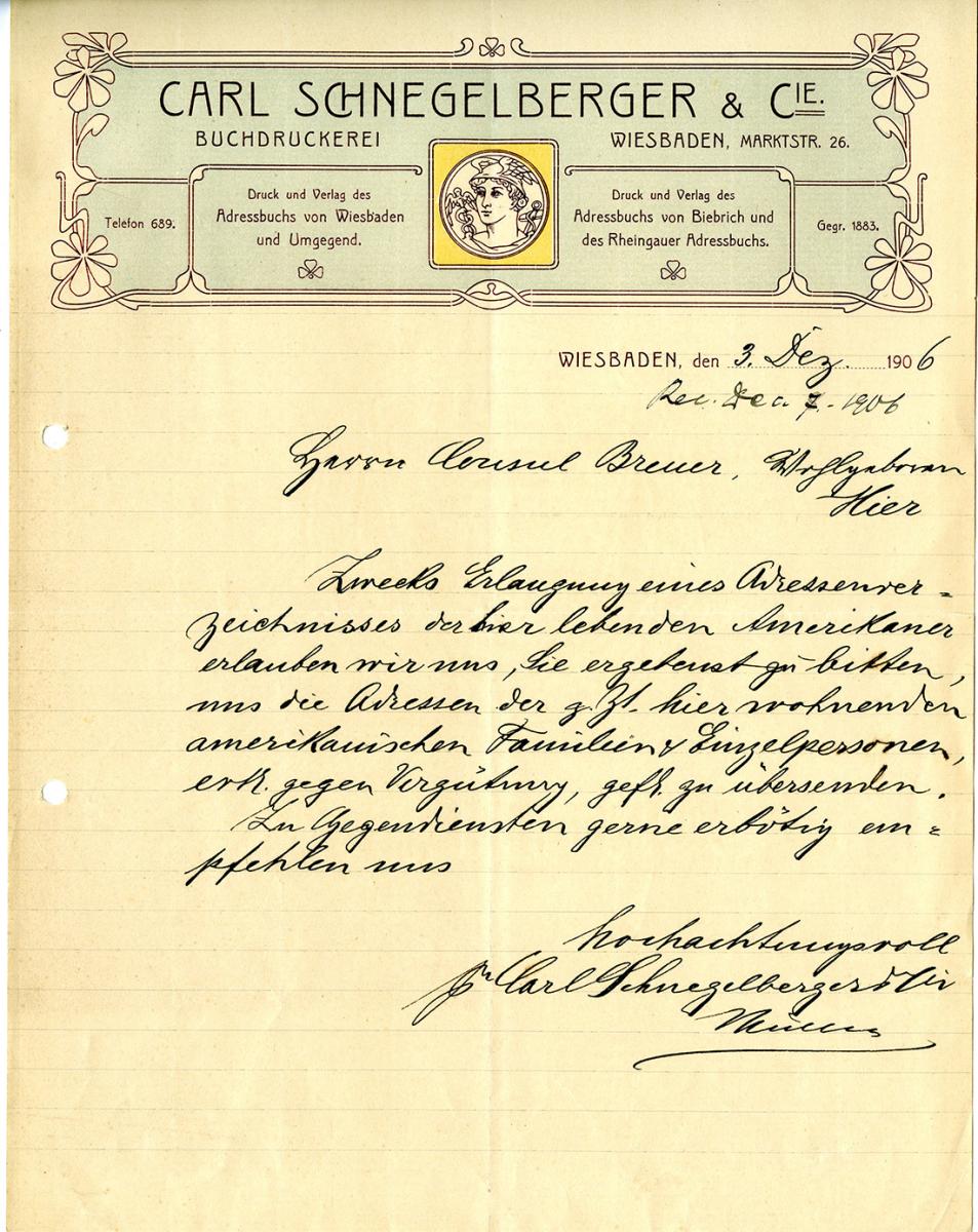 The lettering and decoration of a German publisher’s stationery showcase the Art Nouveau style then popular in Europe. The publisher wrote to the American consular agent in 1906 to ask for names and addresses of Americans living in the area who might use their services.