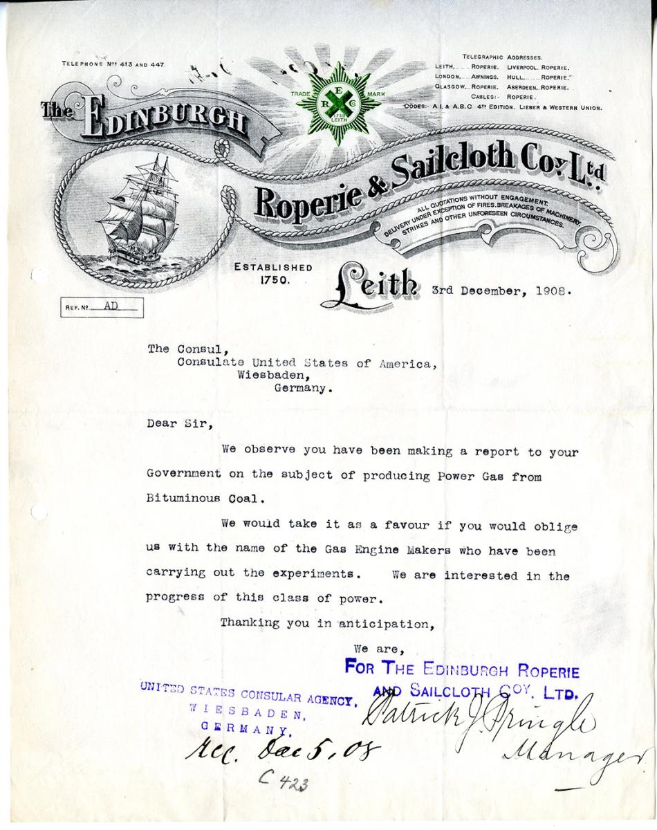 The Edinburgh Roperie & Sailcloth Company uses a rope outline and a picture of a tall-masted sailing ship to establish its identity. The company manager wrote in December 1908 to the U.S. consulate at Wiesbaden to inquire about experiments to produce power gas from bituminous coal.