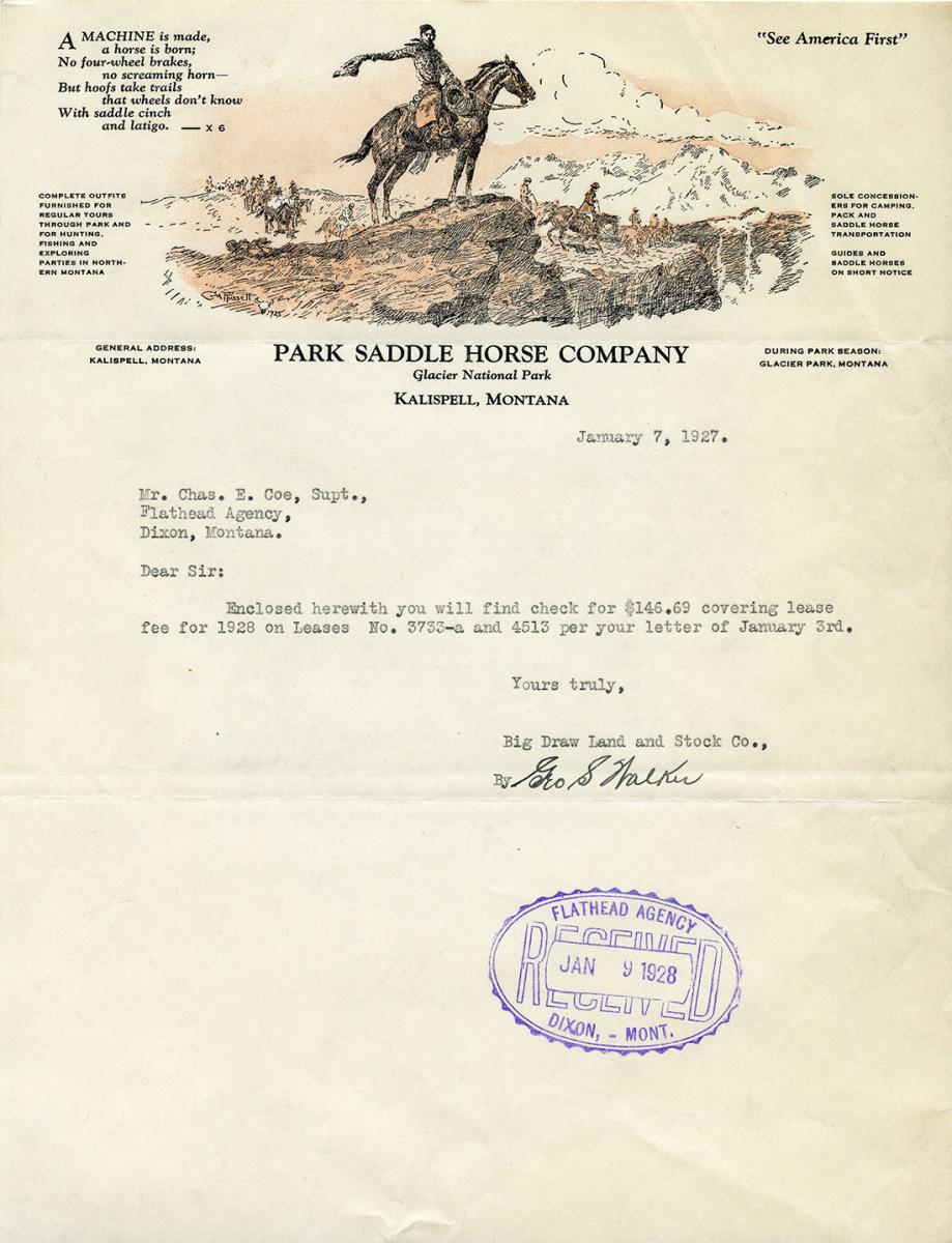 A touring and hunting concessionaire in Glacier National Park reproduces a Charles Russell drawing of rugged cowboys on a trek (with a bonus at the top—a poem in praise of horses). The Park Saddle Horse Company was transmitting payment for leases to conduct its business in the park.