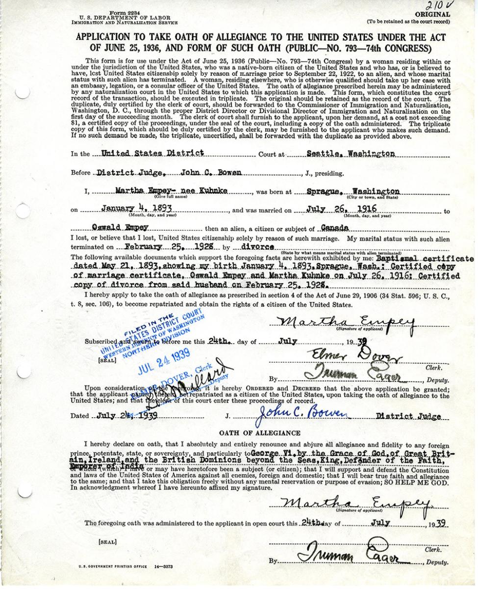 An act of 1936 provided marital expatriates—whose marriages to aliens had ended through death or divorce—with an opportunity to regain their lost citizen-ship by filing an application. Upon approval, women could resume citizenship simply by taking an oath of allegiance. This act required the proof of her U.S. birth or naturalization as well as proof that the marriage had ended. Women flocked to the courts to file their applications. Women involved in ongoing marriages continued to file the regular paperwork for naturalization until 1940.