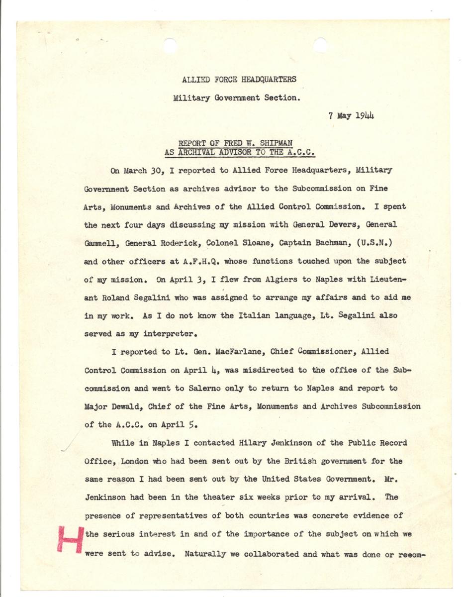 On May 7 Shipman submitted a summary report of his mission to the military government section of AFHQ. After providing a brief background of what he had done in Italy, Shipman emphasized that an archivist is a records expert.