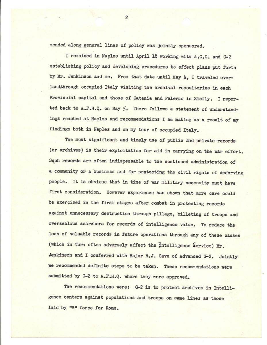 He recommended that an American archivist, who would give attention to the protection, preservation, and rehabilitation of Italian archives, be appointed and that he be attached to the MFA&A subcommission: