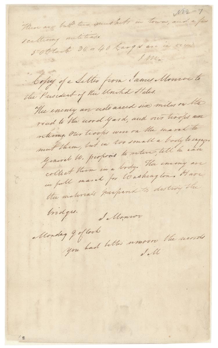 “The enemy are in full march for Washington. Have the materials prepared to destroy the bridges,” Monroe wrote. And in a significant postscript, he added: “You had better remove the records.”