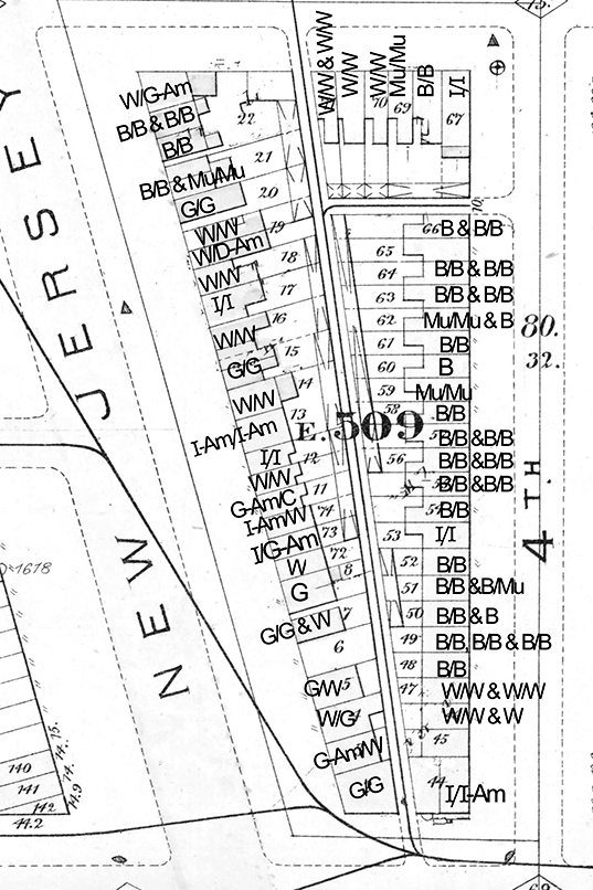 A small group of black households were book-ended by several white families on the northern end of Square 509E and one large group on Fourth Street. Whites had the southern tip of the square and most of New Jersey Avenue, and small groups of blacks lived on the northern end. On New Jersey Avenue the dividing line of black and white lay between 1606 and 1608. On Fourth Street it is almost all black from 1608 to 1644 with the exception of 1618.