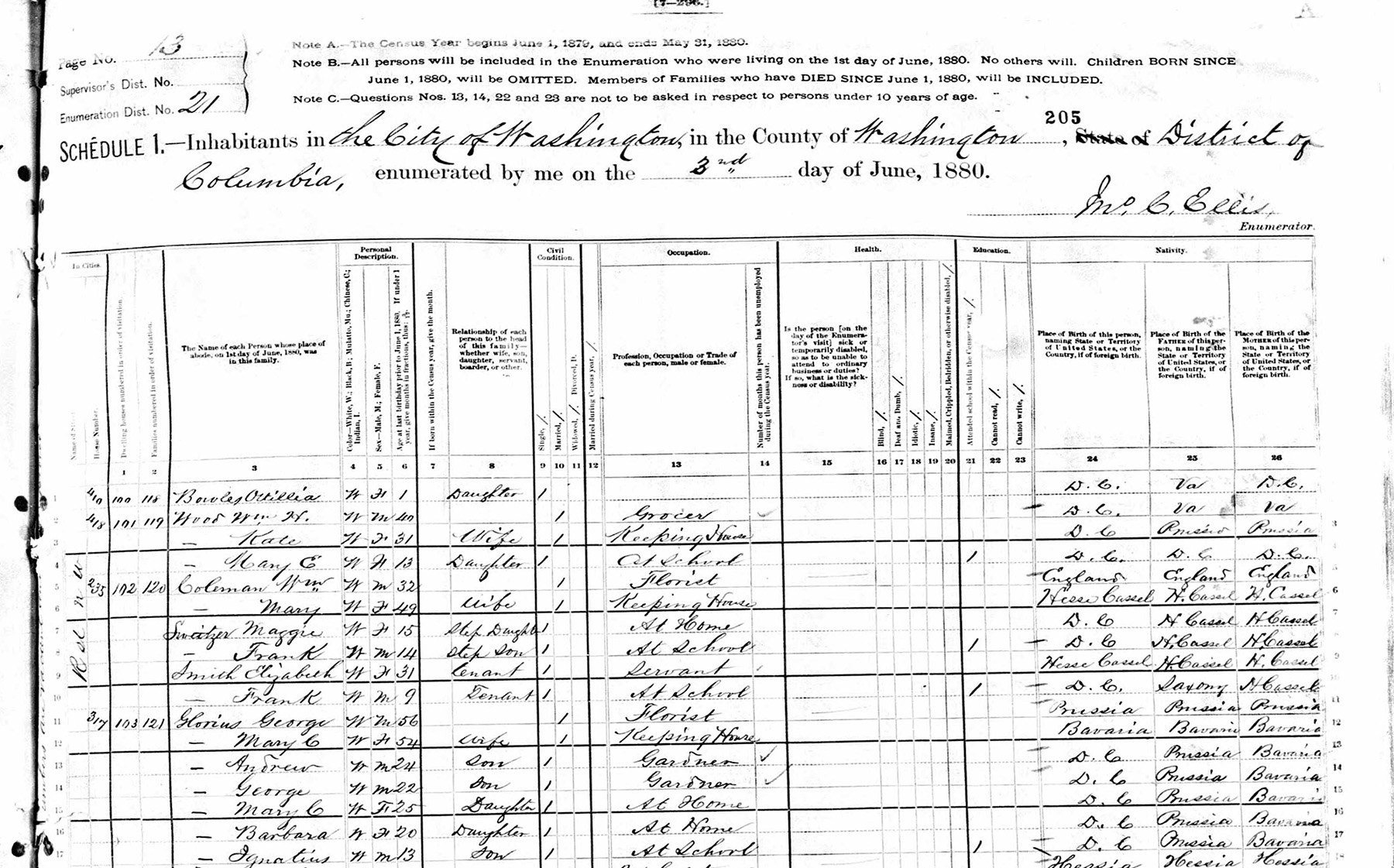 Tenth Census of the United States, 1880: District of Columbia (National Archives Microfilm Publication T9, rolls 121–122); Records of the Bureau of the Census, Record Group (RG) 29, National Archives and Records Administration, Washington, DC.