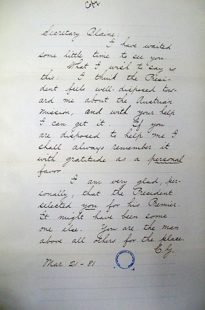 Guiteau again wrote Blaine on March 21, saying that he believed Garfield was “well disposed toward me about the Austrian mission, and with your help I can get it.” He then expressed his belief that the President had made the right choice in selecting Blaine as his secretary of state and that he was “the man above all others for the place.” It is uncertain why he once again mentions the Austrian mission. Did he mean to write Paris, or was he just covering all his bets?
