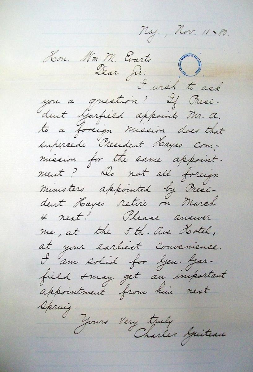 After Garfield’s election in 1880, Guiteau wrote to the presiding secretary of state, William M. Evarts, asking if it was required for all foreign ministers under President Rutherford B. Hayes to retire when the new administration took office the following March. He added that it was quite possible he could be appointed to a very important position once President-elect Garfield entered the White House.