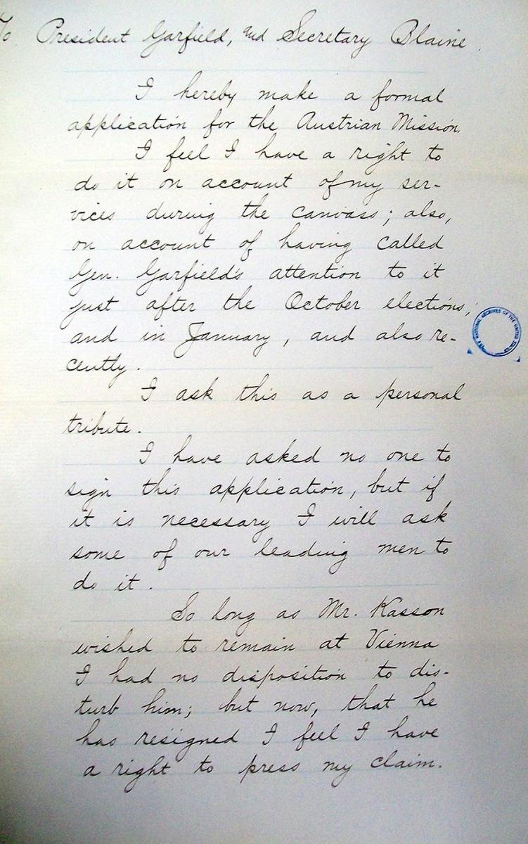 Guiteau wrote to both President Garfield and Secretary Blaine, claiming a right to the position of consul to Austria “on account of my service during the canvas.” He then added that he felt he should be awarded this post as a “personal tribute” for his efforts.