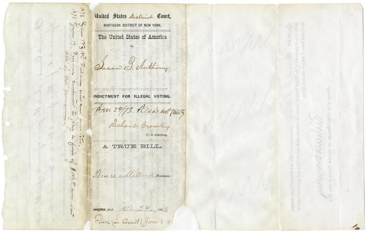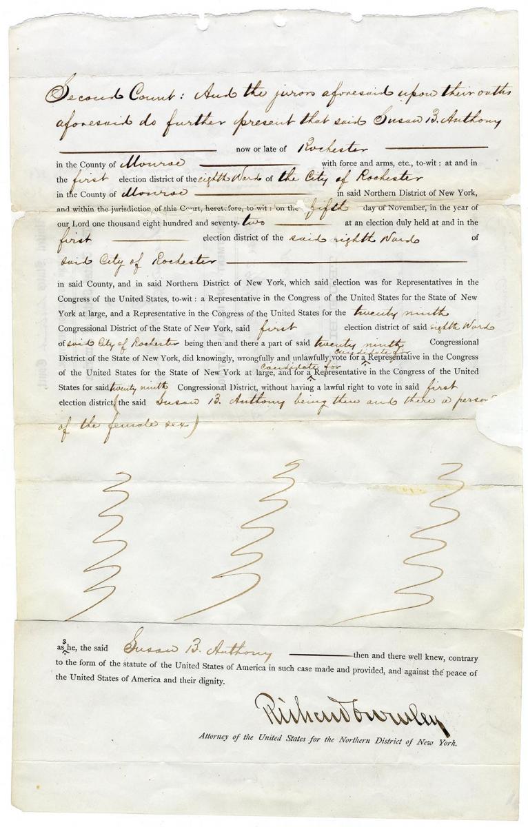 Before the election, Anthony and 14 other women from the same district had successfully registered to vote, but after casting their ballots, they were arrested for voting without “a lawful right to vote.” Only Anthony, however, was brought to trial. The indictment declares that “the said Susan B. Anthony being then and there a person of the female sex” did “knowingly, wrongfully and unlawfully” vote.