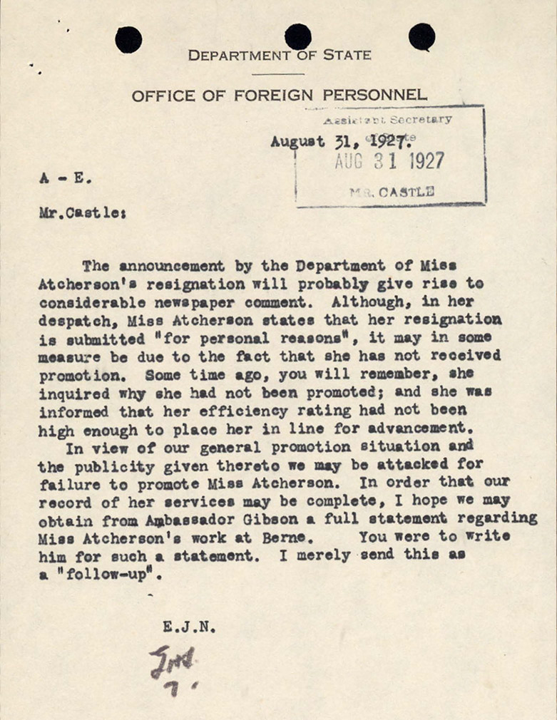 Where many online sources offer this “Cliff’s Notes” version of Atcherson’s life and employment, her official personnel folder holds a much deeper and more complete picture of the life and work history of this pioneer. For example, Atcherson’s federal employment began on December 4, 1922. Her personnel file contains details about the training she received and her appointments to several foreign offices throughout her career. She operated as a Foreign Service Officer for several years and received average efficiency ratings. She did, indeed, complain that she had not been promoted, and that letter can actually be found in her personnel folder. The complaint was succinct and detailed her work, noting that she never received a poor/unsatisfactory efficiency rating as well as the fact that all of the men hired when she was had been long since promoted.