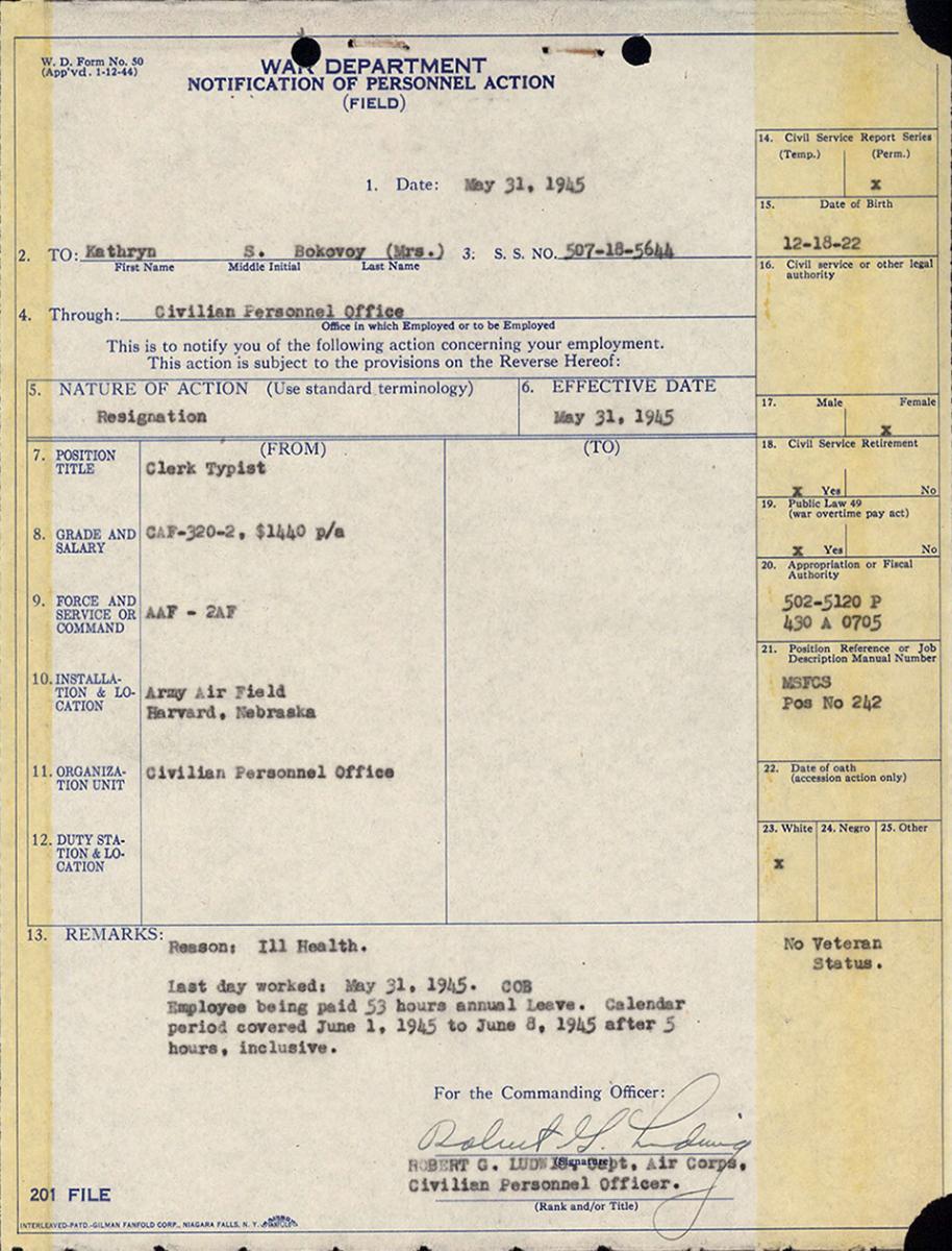 11. Kathryn Bokovoy, Department of the Army Air Force Official Personnel Folder, resignation due to ill health.