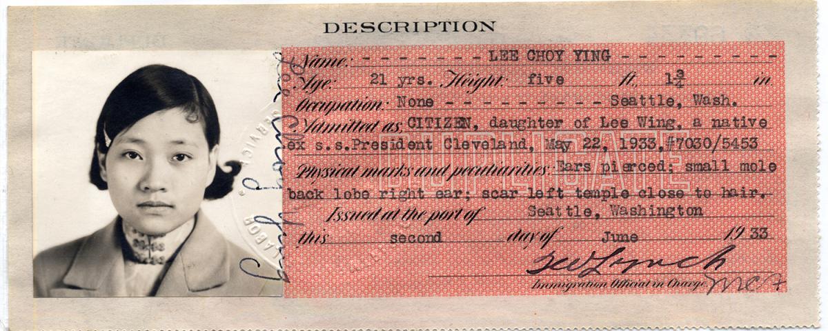 Gwai Ying boarded the SS President Cleveland accompanied by Wong Quong Hing, a friend of Wong See Duck. Gwai Ying arrived in Seattle on July 21, 1933. Her alleged father, Lee Wing, and her alleged sister, Lee Gim Gook, who had arrived in February 1933 with Wong See Duck, were questioned by immigration officials separately from Gwai Ying. Their testimonies about their family history matched with Gwai Ying’s account, and she was granted a certificate of identity, which affirmed her legal status as an immigrant. After staying a few days in Seattle, Gwai Ying, Lee Gim Gook (whose true name was Leung Louie Gin), and Wong Quong Hing took the train to Oakland, California, where they were met by Wong See Duck. He promptly confiscated Gwai Ying’s certificate of identity.