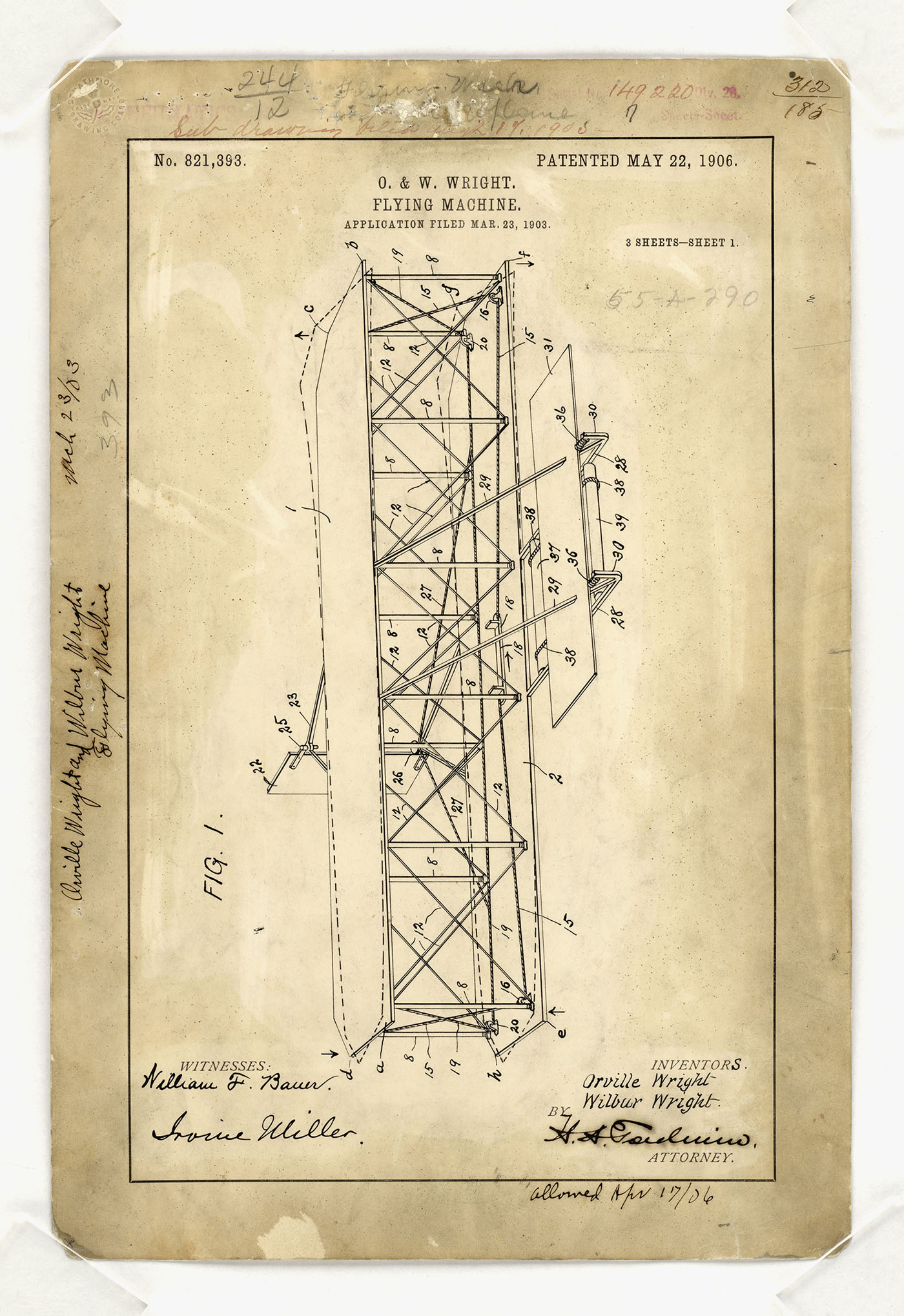 A recent recovery was very big indeed. Decades ago, we loaned out a document called Patent No. 821,393. It's otherwise known as the patent application for a "flying machine" filed in 1903 by Orville and Wilbur Wright and approved in 1906. The Smithsonian Institution had borrowed it and returned to us over 30 years ago, and its return was duly noted on our records.
