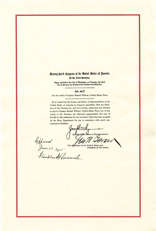 Archivists Rodney Ross and Jane Fitzgerald at the National Archives and Matthew Brawn at the Law Library of the Library of Congress provided critical copies of Private Law 79 for the relief of Russell Willson and the “Red Line” bill signed personally by the Speaker of the House of Representatives, the Vice President of the United States as President of the Senate, and President Franklin D. Roosevelt.