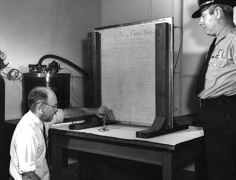 Before the National Archives was established, the Department of State safeguarded the federal government’s official records. Unlike the Declaration, which had been on display, the Bill of Rights remained in storage.