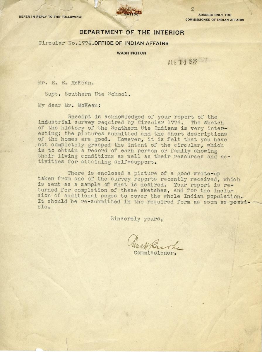 Newly named Consolidated Ute Agency Superintendent E. E. McKean submitted his initial report on June 30, 1922, and added the caveat near the end: “Although this report in many respects will appear too brief for one of such importance, it is hoped that the Office will bear with me.”19 The office would not. Burke fired back in August that the superintendent had failed to grasp the intent of the report and returned it wholesale with a list of desired changes.20