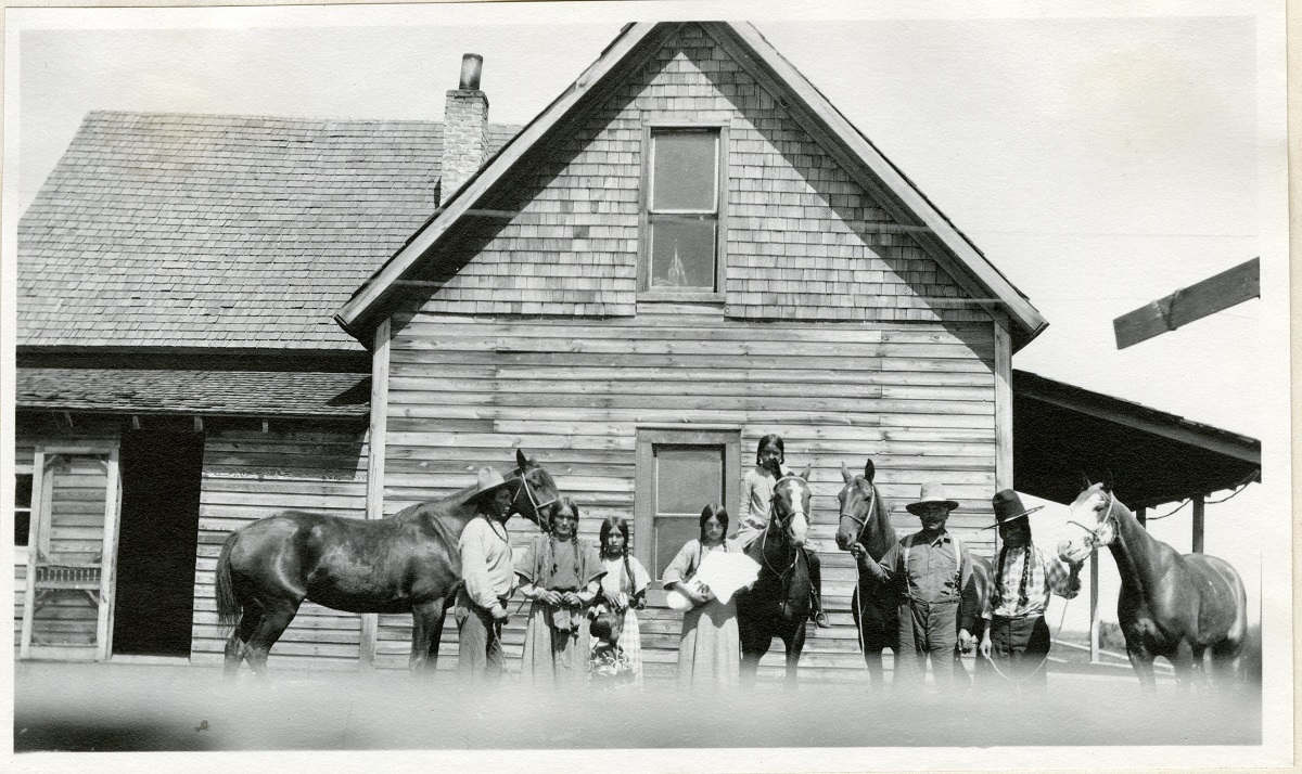 Alexander Calowahcan, a 49-year-old Flathead, lived four miles south of Ronan, Montana, and was married with three children, two of whom regularly attended school. He owned two work horses, nine ponies, and one milk cow and was planning on sowing a combined 55 acres of wheat and oats in 1923.25 The extra men and children in his survey photograph are unidentified.