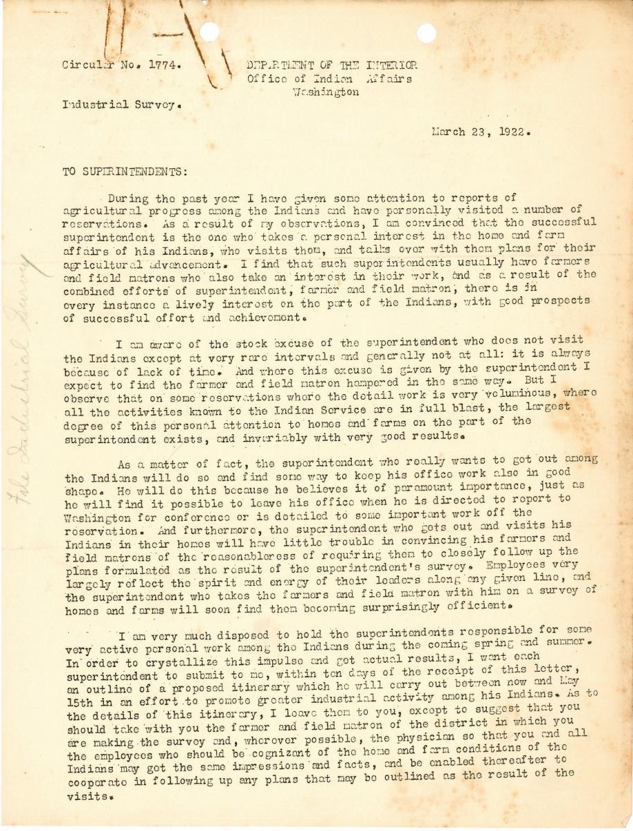 Issued by the BIA headquarters, circulars addressed a number of administrative issues regarding education, land, finances, issues, personnel, and new rules and regulations. Circular 1774, addressed to all superintendents, was entitled “Industrial Survey” and called for just that—industrial surveys to be conducted on Indian reservations.