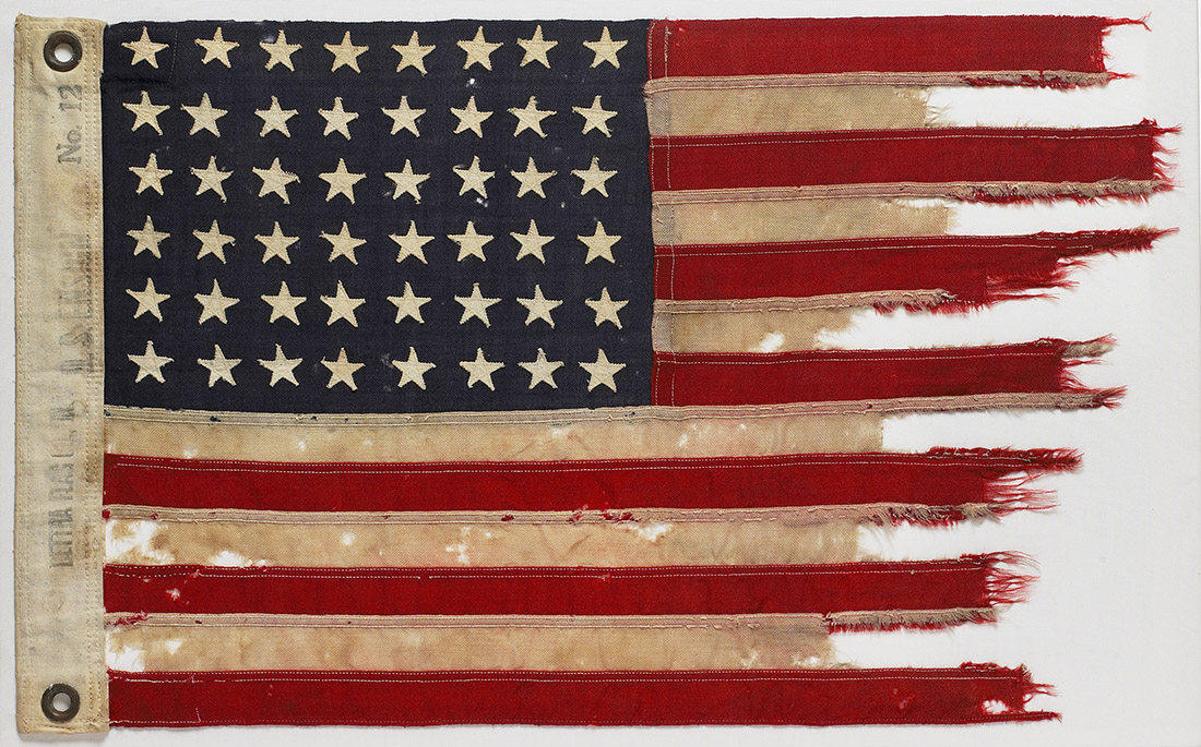 This wind-tattered flag was replaced by a new one shortly before PT 109 was sunk; it is one of the few physical remnants from the boat that still exists.