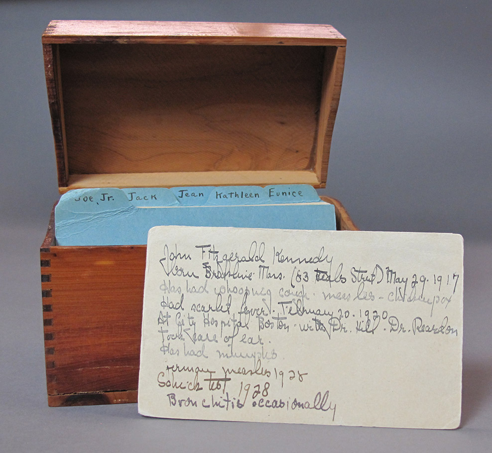 The mother of nine, Rose Kennedy devised a card file system to track her children’s health; she bought this cedar box in Brookline to house the records. On this card for Jack she listed whooping cough, measles, chickenpox, scarlet fever, mumps, German measles and bronchitis. On subsequent cards she chronicled an appendectomy, tonsillectomy, and the constant struggle to keep up his weight.