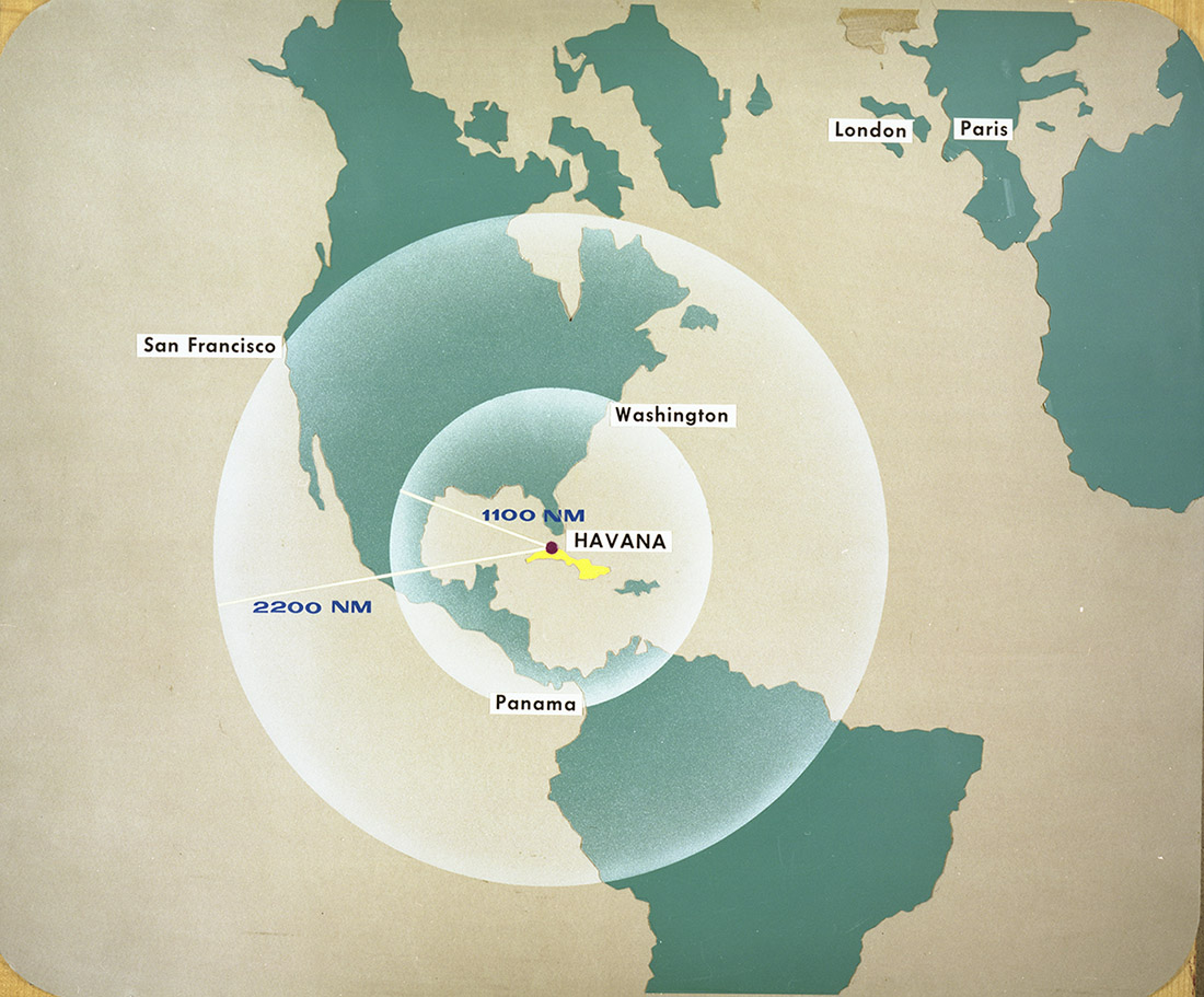 Three months after the crisis was resolved, the Department of Defense conducted a televised press briefing chronicling the Soviet Union’s buildup and subsequent removal of nuclear weapons from Cuba. This board was used during that briefing to illustrate the gravity of the threat—nearly the entire United States was within range of the missiles.