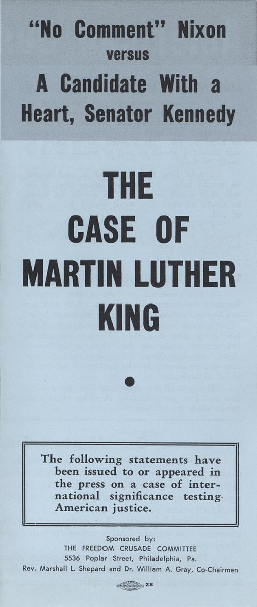 In the final days of the race, JFK’s campaign printed some 3 million of these pamphlets, publicizing the endorsements of Martin Luther King, Jr.; his father, Martin Luther King, Sr., an influential Baptist minister; and other civil rights activists. (Kennedy and his campaign had expressed support and been instrumental in King’s release following his arrest for taking part in a peaceful protest of a whites-only restaurant in Atlanta, Georgia.) On the Sunday before Election Day, the pamphlets were distributed in African American churches across the country. The pamphlet came to be known as the “blue bomb” for its enormous impact on public opinion. Throughout the episode, the Republican candidate, Vice President Richard Nixon, also contemplated whether to respond and chose to remain silent regarding King’s plight.