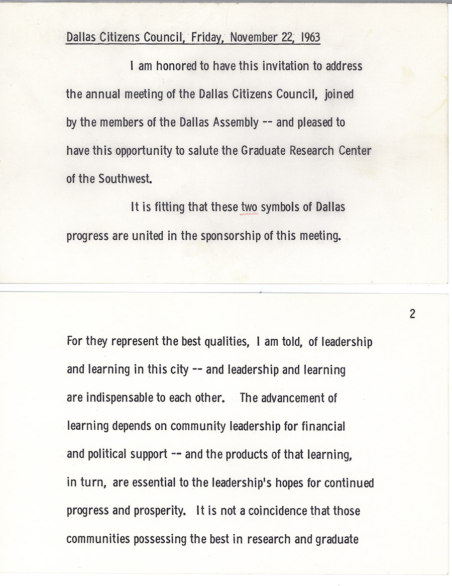 Undelivered remarks for the Dallas Citizens Council, Trade Mart, Dallas, Texas, first two speech cards, November 22, 1963