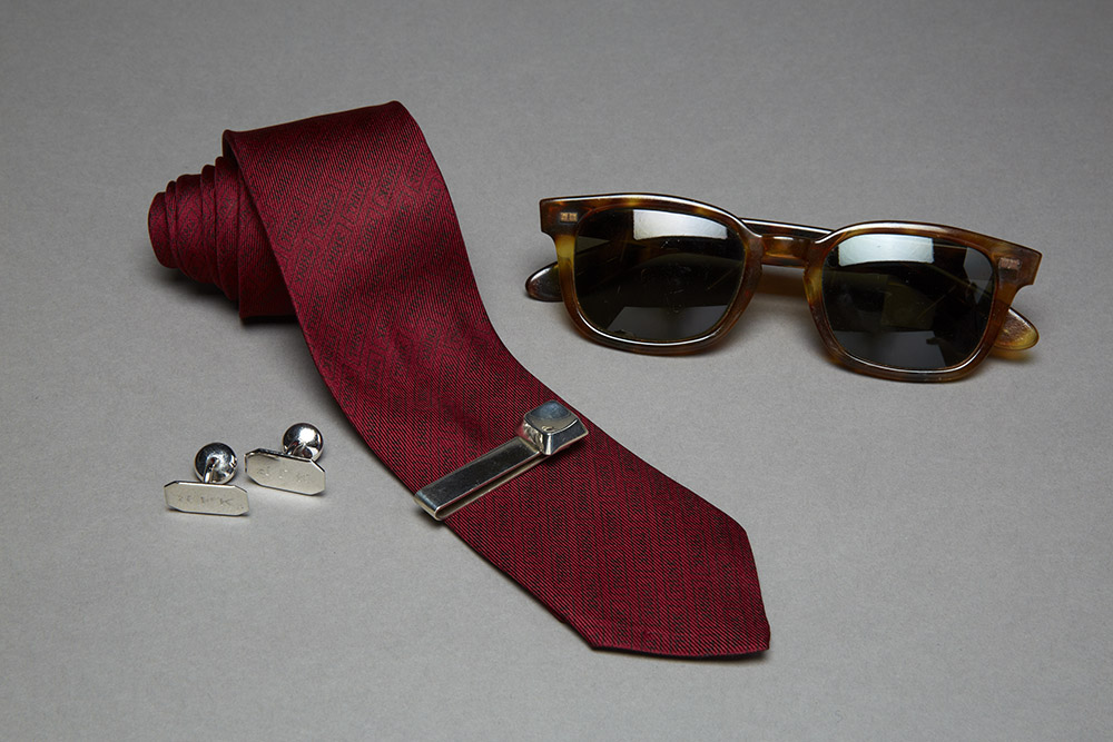 JFK’s sunglasses, cuff links, tie clip, and tie (Kennedy Library)