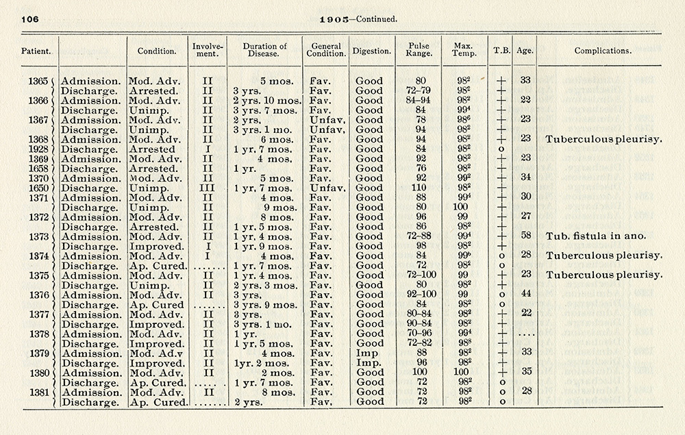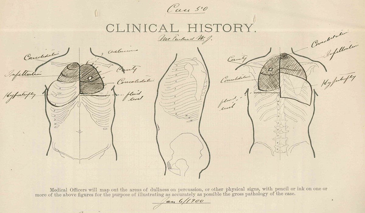 From the opening of the hospital until 1904, patient records were handwritten into ledgers called case histories. Organized sequentially by patient number, these volumes detail the evolving condition and treatment of patients. Clinical histories from the same time, which contained graphics depicting the location of tubercular lesions, were kept separate from the case histories but were organized by patient name and filed along with the post-1904 patient case files. These early files record the patient’s medical history and treatment plans but, unlike the later forms, contain a section for “Probable source and nature of the infection,” which sought to identify where the infection had been contracted.8