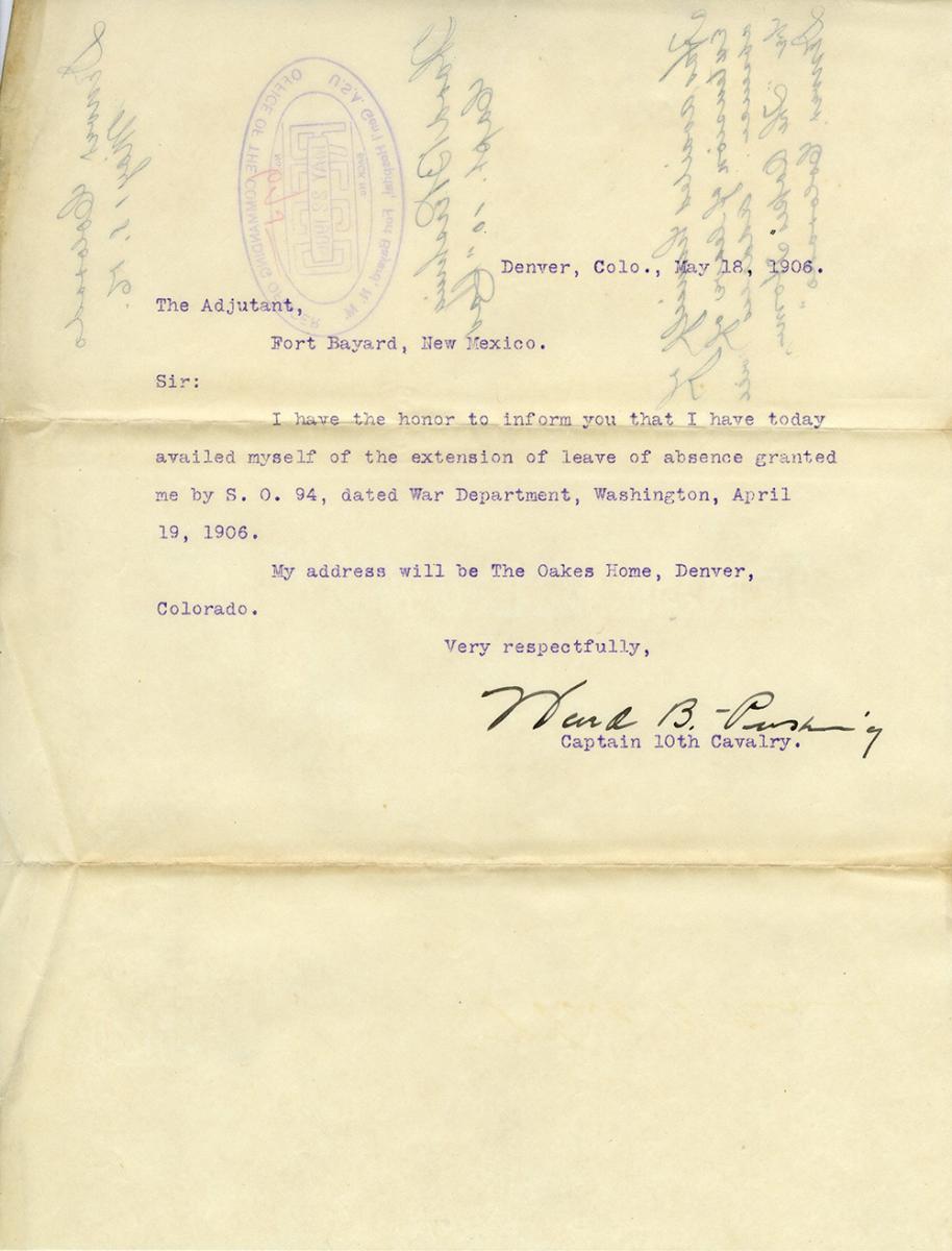 In September Pershing requested yet another leave extension and submitted a letter from his current physician as evidence. On September 6, Dr. S. G. Bonney wrote the Army, “I am convinced it would be very disastrous for him to attempt to return to duty at present, but I do look for a restoration of his activity and usefulness if he can remain a little longer under suitable conditions of life and climate.”18 His request was approved, and the record goes silent until the following year, where the final remark on Captain Pershing in our holdings is a pencil notation on his progress sheet; “left May 14 ’07.”19