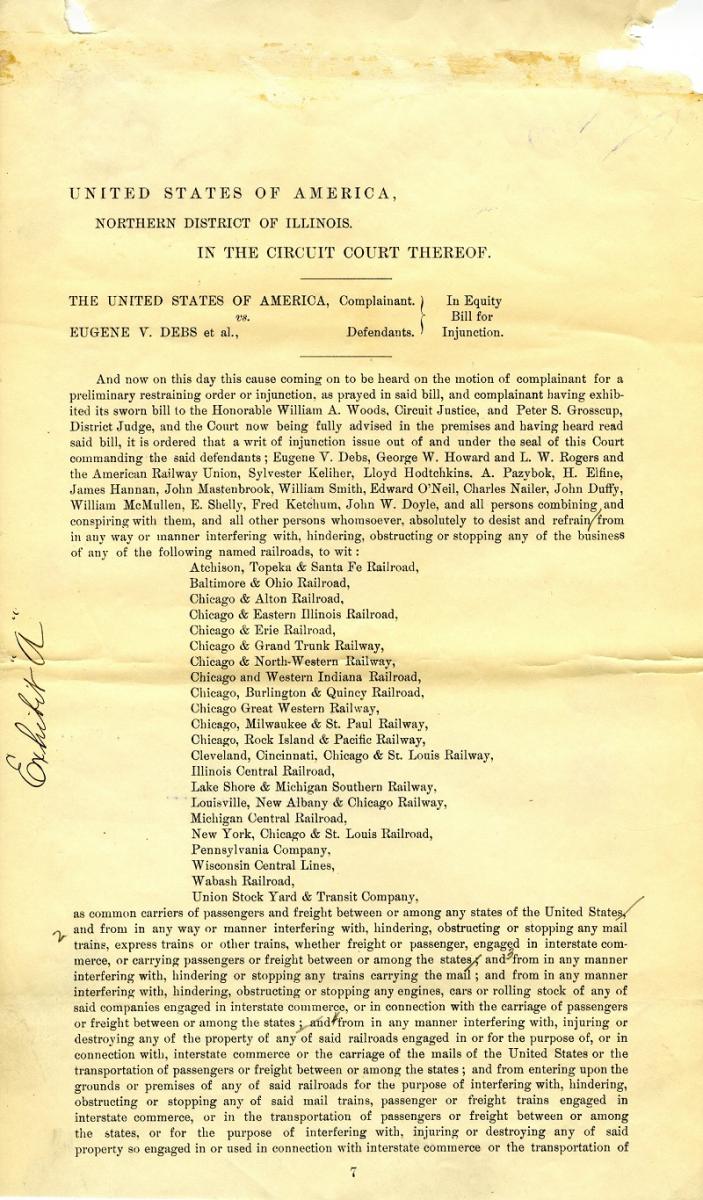 The National Archives at Chicago’s holdings include several prominent federal cases in which Debs was a defendant. Debs was convicted for not complying with the injunction issued during the Pullman Strike is The United States v. Eugene V. Debs, et al. The case is located in Record Group 21, Records of District Courts of the United States, Northern District of Illinois, Eastern Division, U.S. Circuit Court, Chicago, Civil Case Files, 1871–1911, Equity Case 23421.