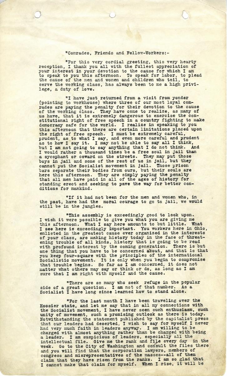 Following a raucous applause, Debs addressed the gathered crowd. He first pointed to the Stark County Work House that sat on the periphery of the park. Inside, he noted, were three prominent antiwar activists and fellow socialists, Charles Ruthenberg, Alfred Wagenknecht, and Charles Baker, who had been convicted the previous year for inciting resistance to the draft. Debs, in his dynamic speaking voice, prefaced his coming remarks by telling the crowd that he had to be “extremely careful, prudent, as to what I say, and even more careful and more prudent as to how I say it.” He added that “I may not be able to say all that I think; but I am not going to say anything that I do not think.”