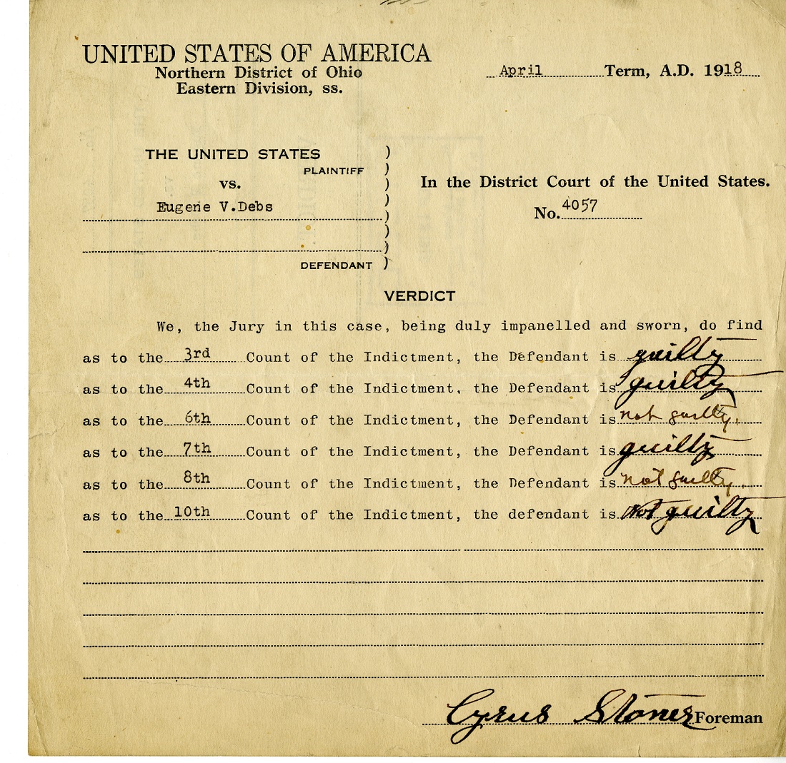 Debs concluded his address telling the jury, “My fate is in your hands. I am prepared for the verdict.” With that the jury retired to deliberate. Debs’s fate, however, was little in doubt. The jury returned after a lengthy recess and read the verdict: guilty on three counts.