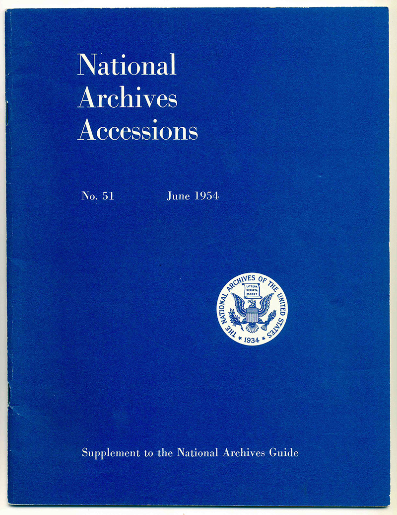 The Archives released this first expanded issue of Accessions in June 1954 with a print run of 1,500. Its feature article, “The Continental Congress Papers: Their History, 1789–1952,” followed the papers’ history from the close of the Continental Congress until their arrival at the National Archives.