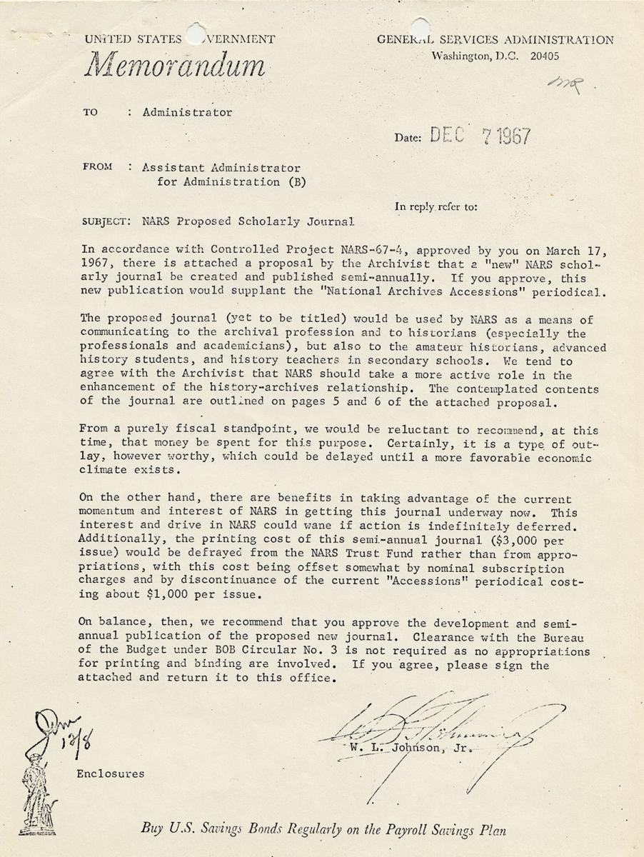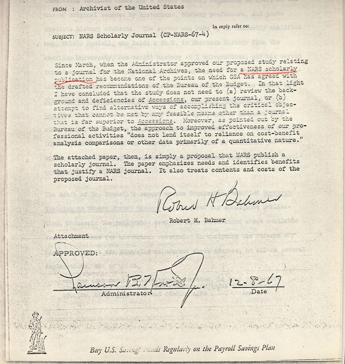 A General Services Administration (GSA) memorandum signed on December 8, 1967, gave the official go-ahead to the National Archives and Records Service (NARS) to start up a scholarly journal. The proposal from Archivist of the United States Robert H. Bahmer stated: “The proposed journal (yet to be titled) would be used by NARS as a means of communicating to the archival profession and to historians . . . , but also to the amateur historians, advanced history students, and history teachers in secondary schools.”